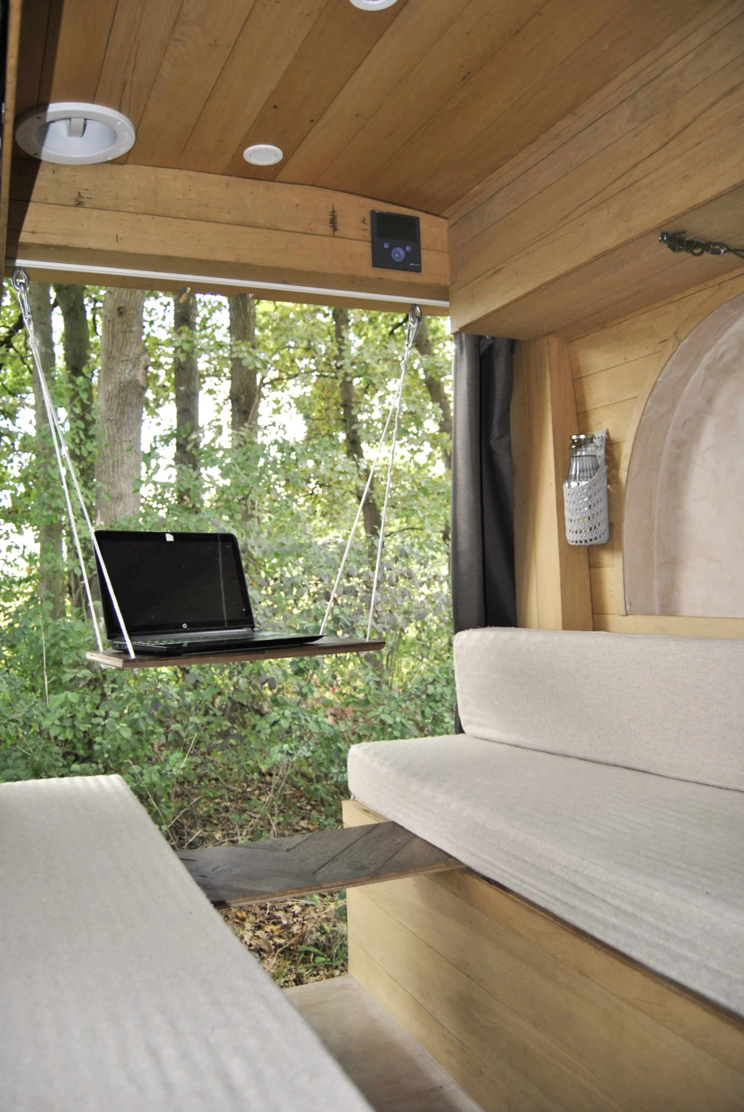 Interieur van een camper met uitzicht op groen buiten, met een hangende bureau, een bank met roze-beige bekleding en houten afwerking