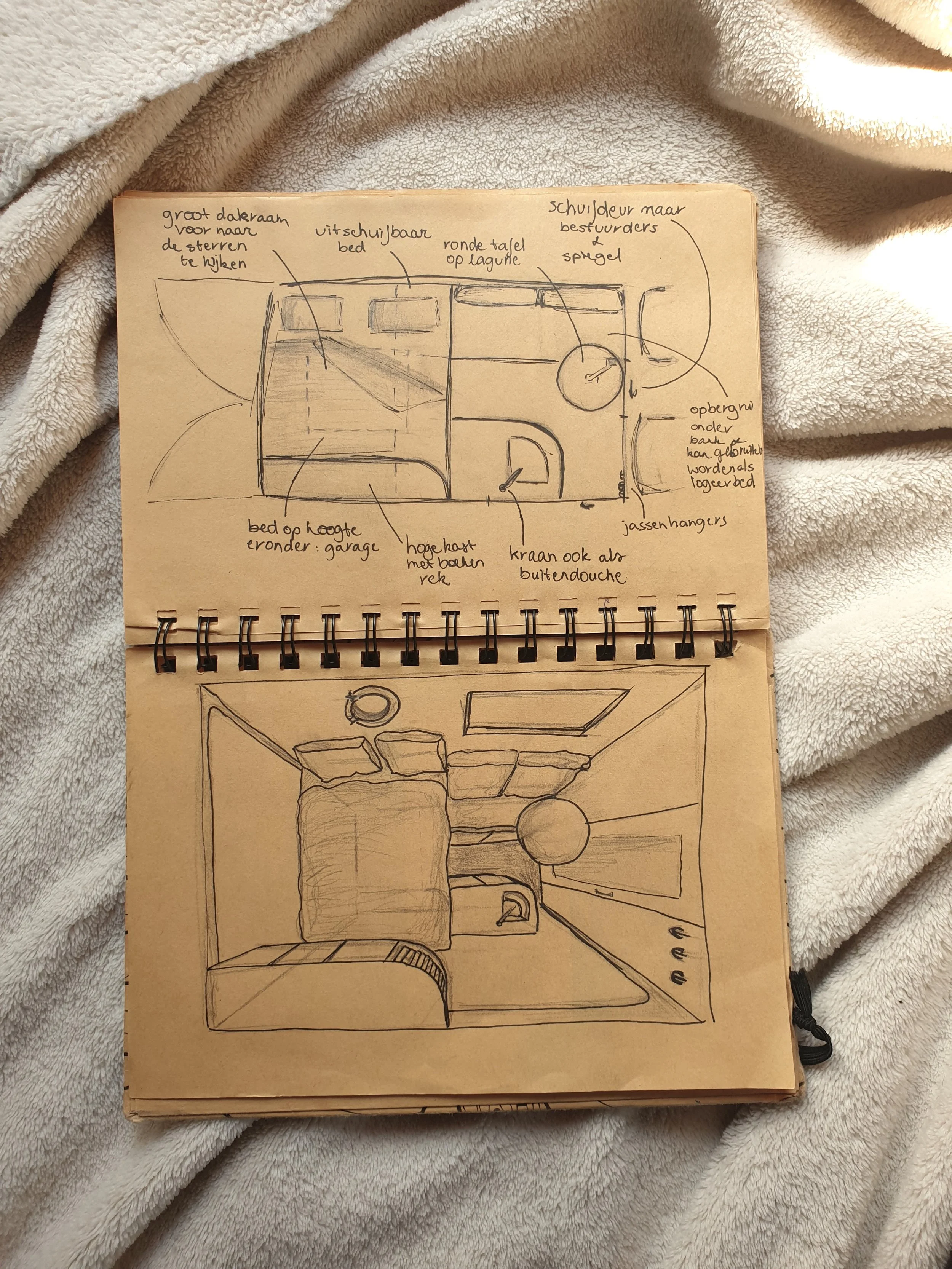 Twee schetstekening van een camperinterieur. Een grondplan met aantekeningen in het Nederlands, inclusief bed, kast, spiegel, en opbergruimte. En een 3D tekening ervan in bovenperspectief.
