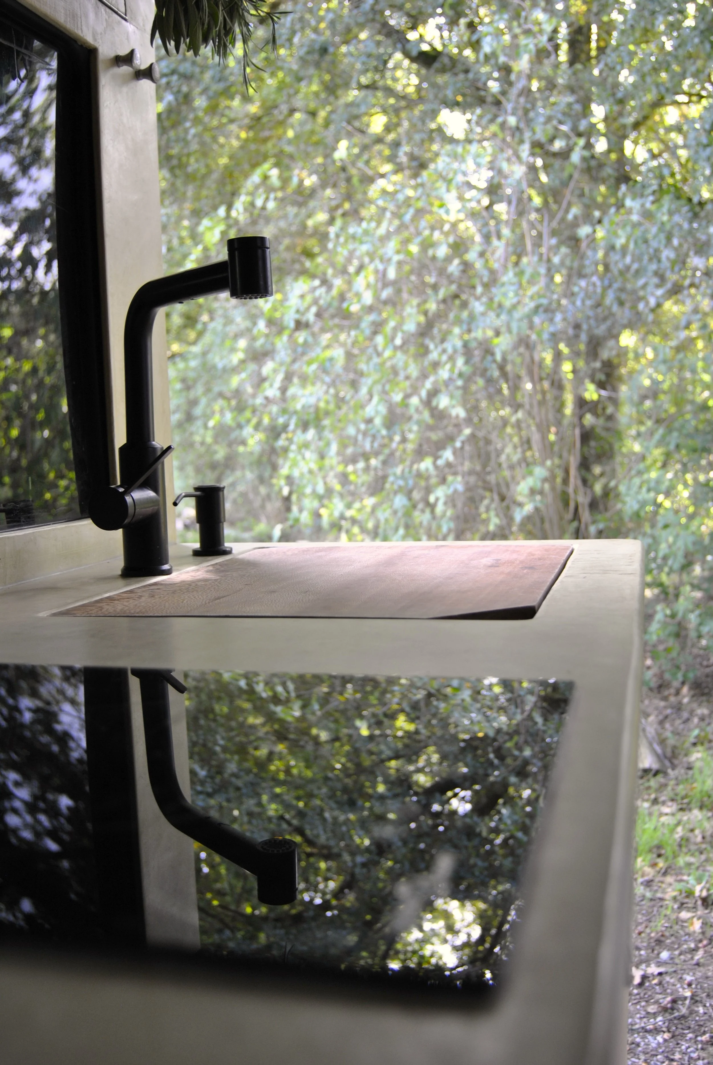 Een moderne gootsteen met een zwarte kraan en een platanen houten snijplank en een inductievuur in een campervan.