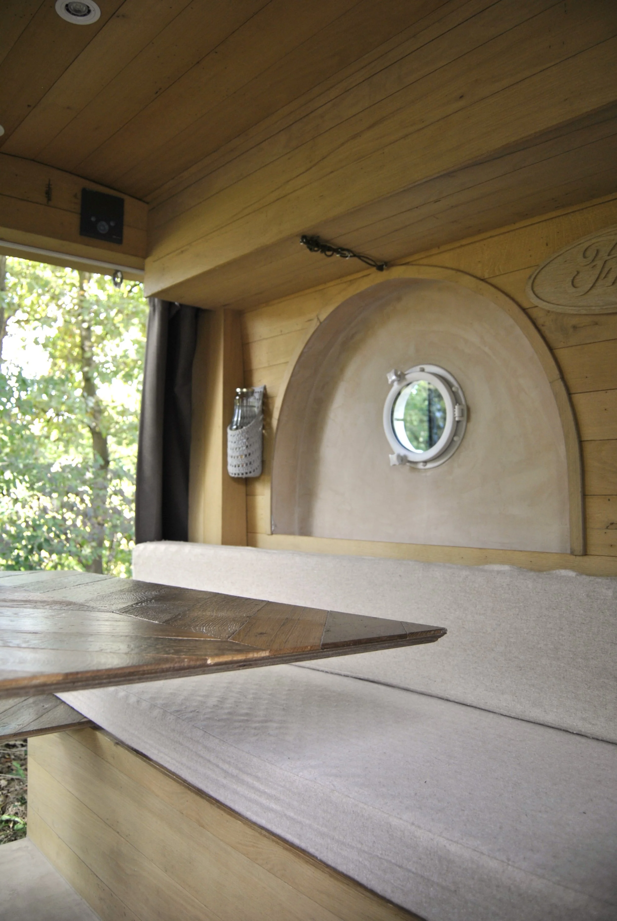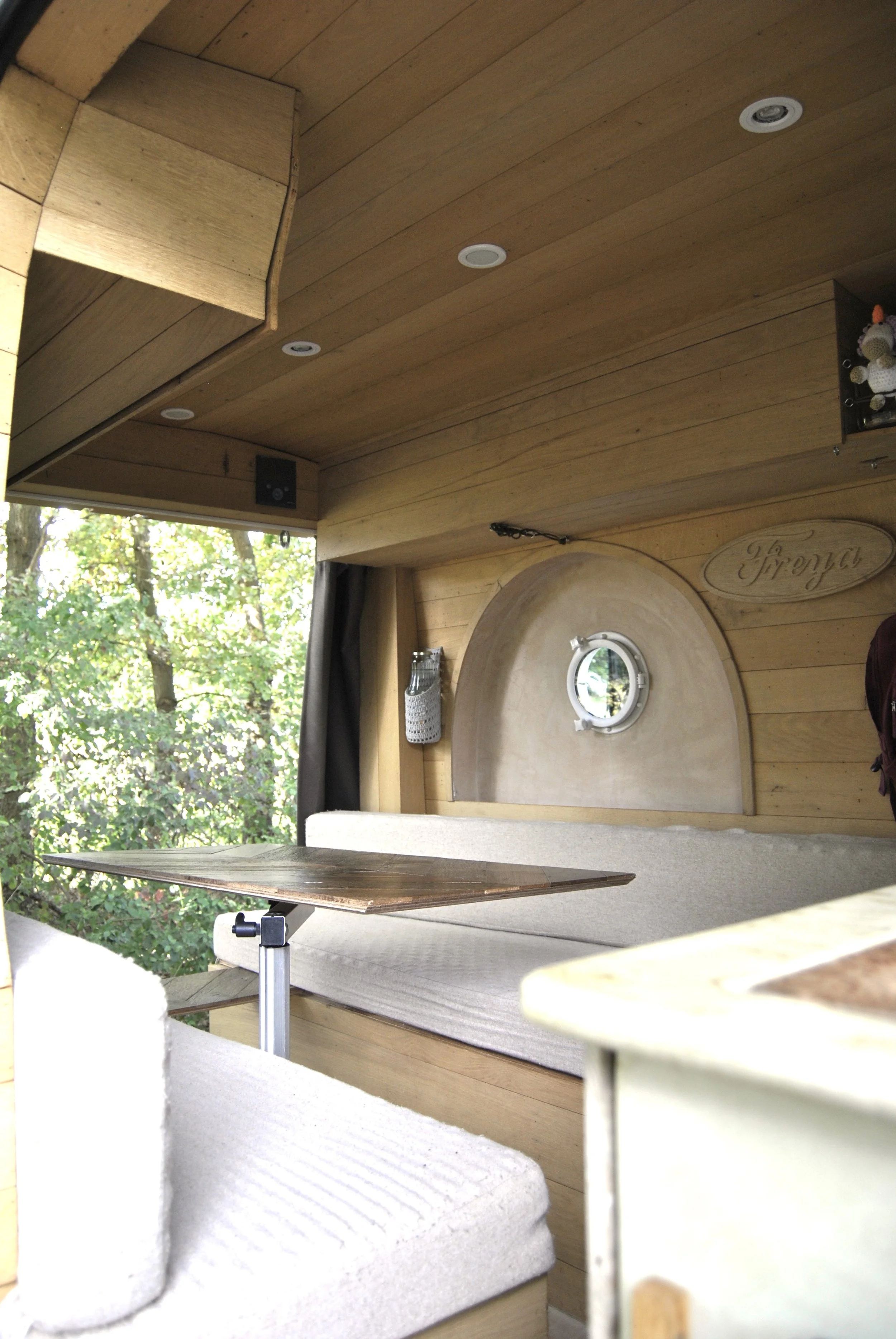 Leefruimte met tafel en zetels in een campervan met een klein rond raampje, patrijspoort, houtafwerking