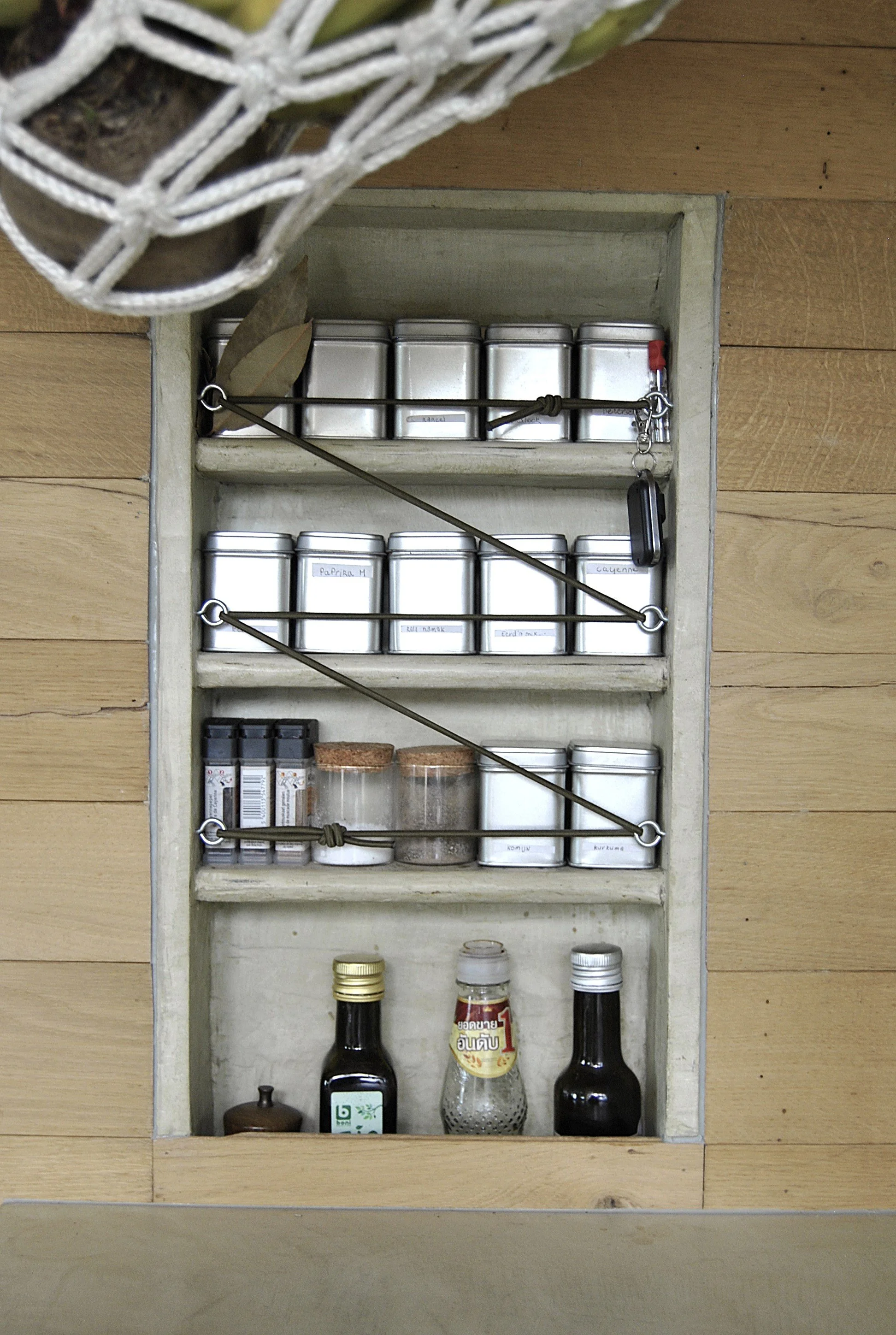 Hangmat voor het fruit en de groenten en een kruidenkastje in mortex ingebouwd in een houten wand in een camper.